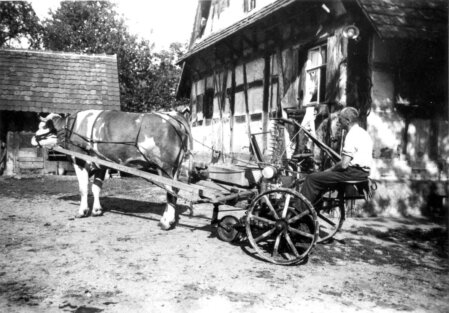 Bild 5: Klosterbauer Friedrich Müller mit Ochsen "Seppli" und seiner Gespannmähmaschine aus den 1920er-Jahren. Ursprünglich wurde sie von zwei Ochsen gezogen und das Mähwerk wurde über die Räder angetrieben. Etwa 1938 rüstete der Klosterbauer die Mähmaschine mit einem Aufbaumotor nach (Zwei-Takter Auto-Union Chemnitz, 123 ccm, 2,3 PS). So lief das Mähwerk unabhängig von den Rädern und der Zuggeschwindigkeit und es reichte ein Ochse vor der Maschine.